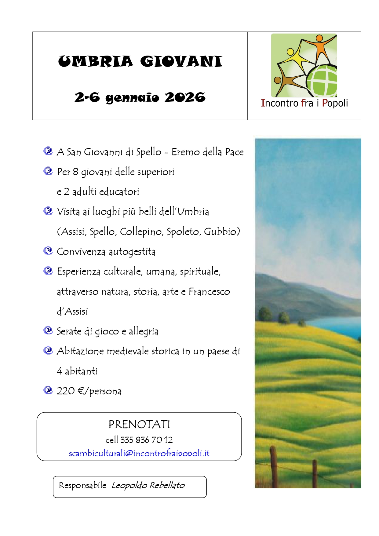 Partecipa a questa esperienza di arricchimento culturale, umano, spirituale, attraverso: natura, storia, arte e Francesco d’Assisi. La giornata si articolerà in momenti di : –visita a luoghi e monumenti fra i più interessanti dell’Umbria; –riflessione ed interiorizzazione, sia personale che di gruppo; –convivialità, gioco, faccende domestiche e preparazione cibo comunitari, notte in camere comuni (separati […]