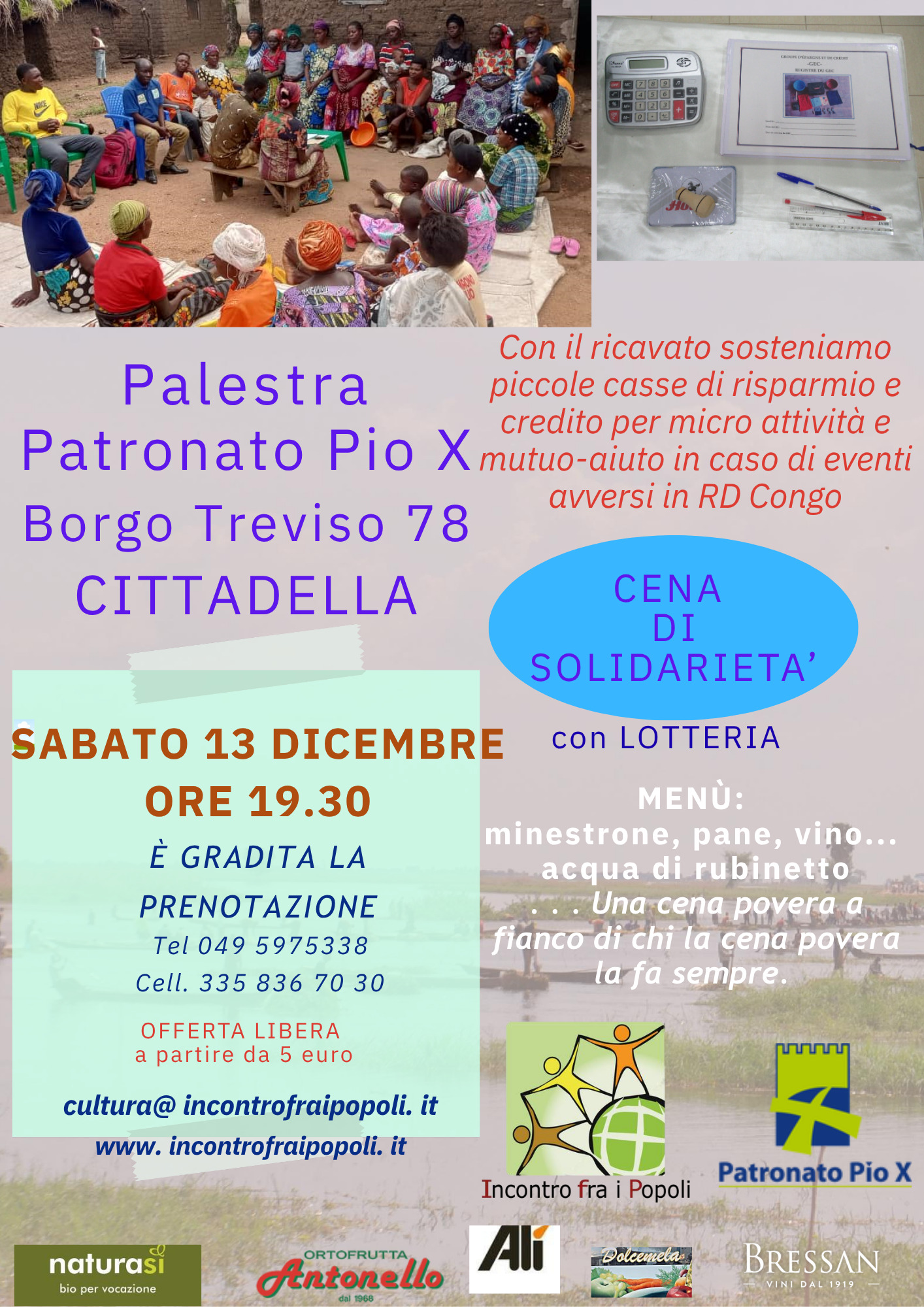 Incontro fra i Popoli ti invita all’annuale Cena di Solidarietà. Momento di convivialità e di condivisione, sarà una cena povera a fianco di chi la cena povera la fa sempre. Sabato 13dicembre 2025, ore 19:30 Palestra Patronato Pio X, via Borgo Treviso, 78 – Cittadella Segnalo in agenda e passaparola
